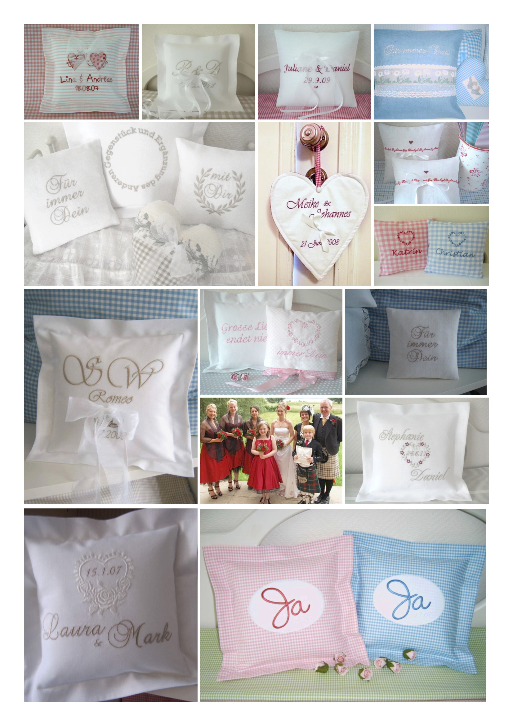 Ich biete Ihnen eine kleine Auswahl an Hochzeitsmotiven an, die auf verschiedenen Stoffen und in unterschiedlichen Schriften angefertigt werden können.